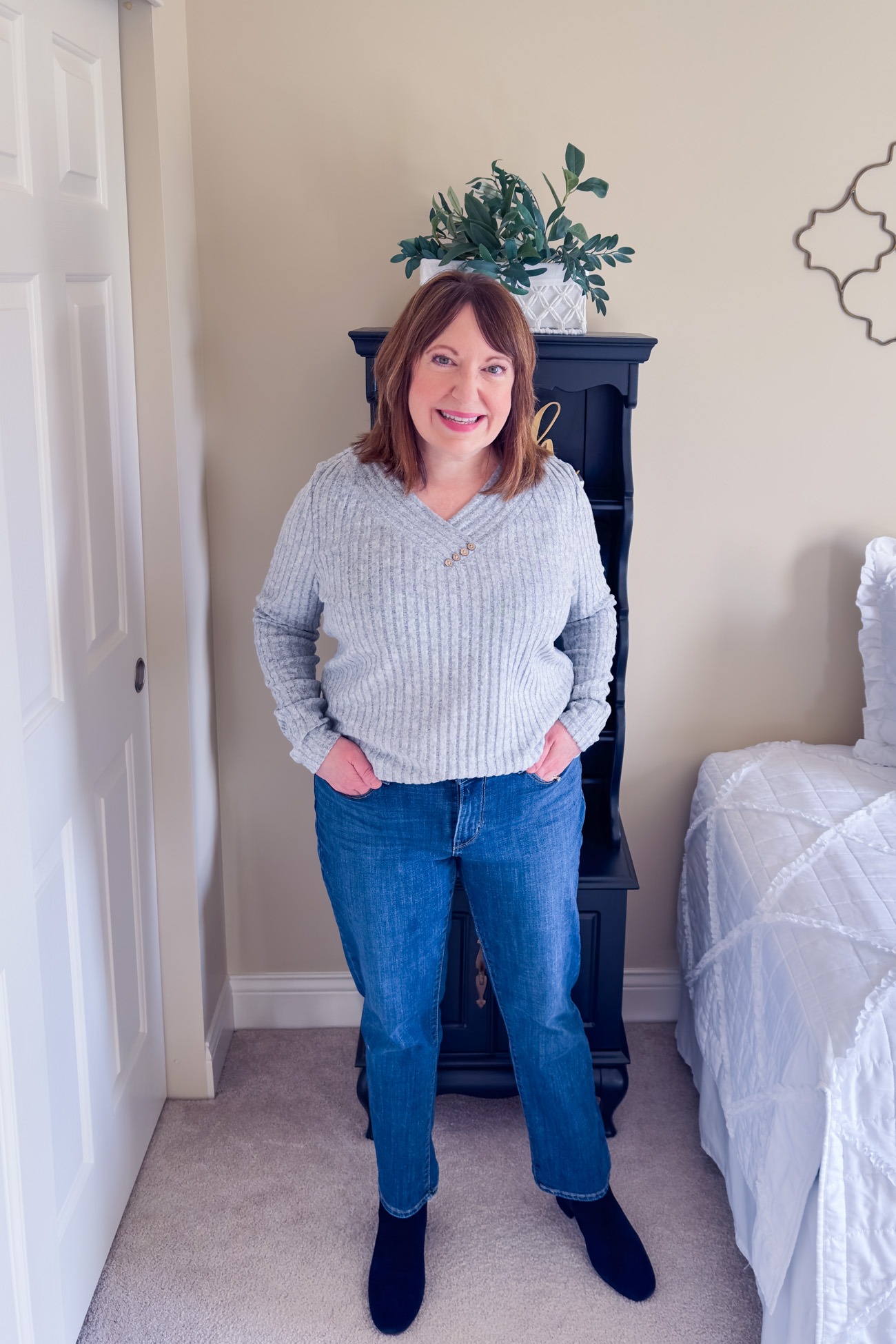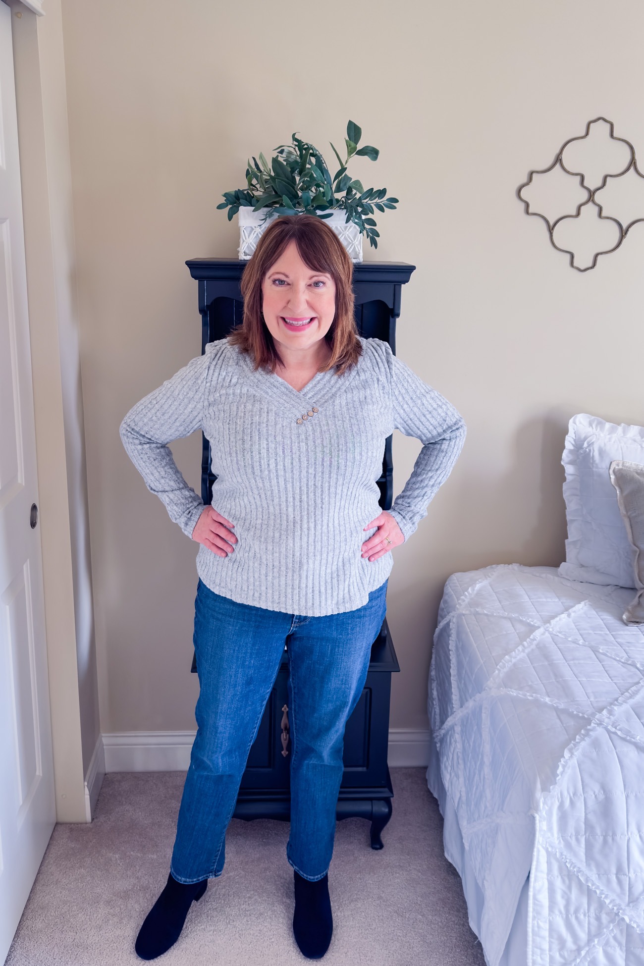 Today, I have 3 easy outfit ideas for styling this ribbed V-neck top from Amazon. When I ordered this top in grey, I was still focused on winter fashion – pairing it with jeans and boots. But I thought this ribbed V-neck top would work for early spring too with blue or white jeans and a spring style shoe. It’s not thick or heavy but will keep you warm on cool spring days. So, it’s a top you can wear now and later!