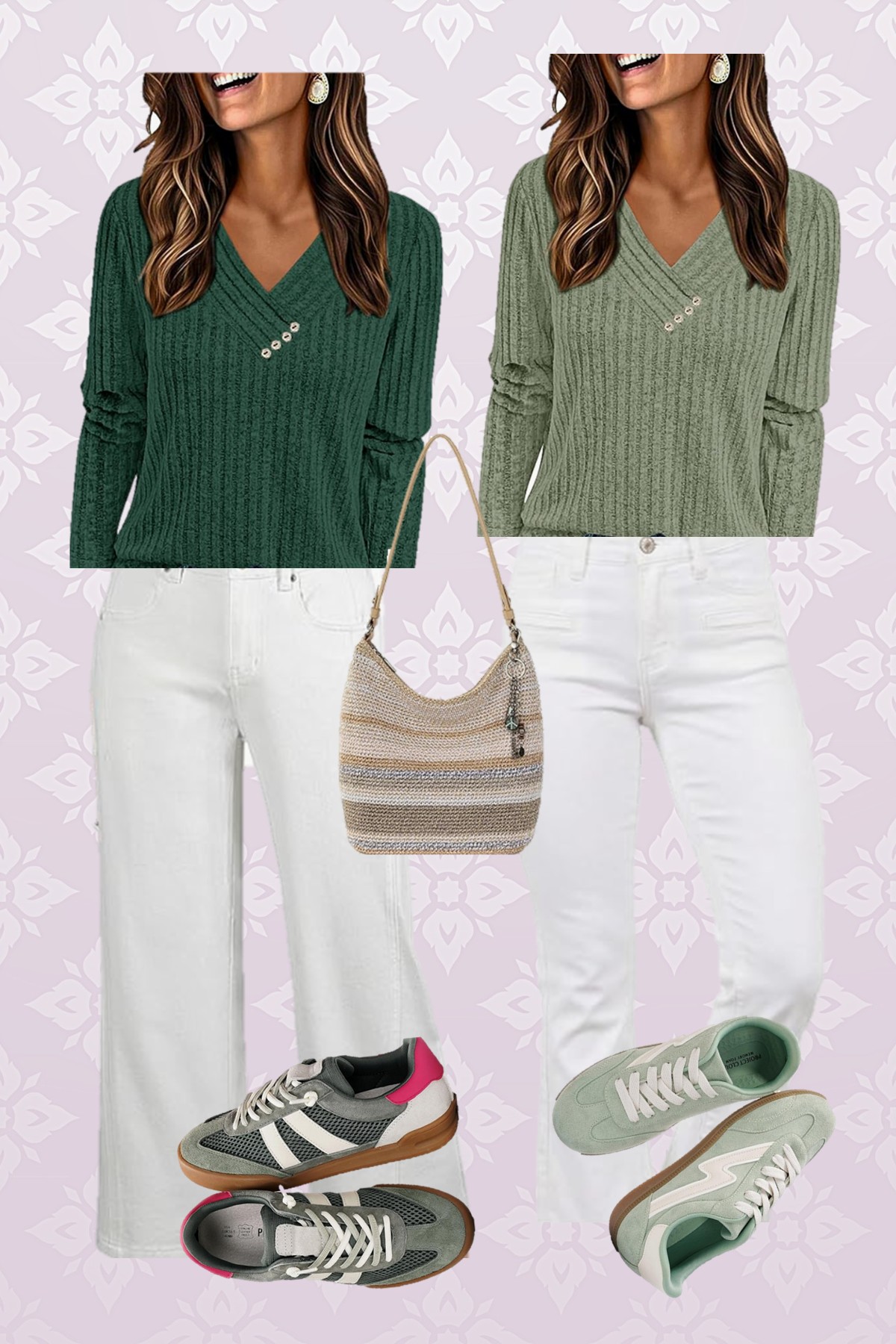 The first look is in the green color options with white jeans and coordinating sneakers. Everything in this look is on Amazon and is budget-friendly with the exception of the handbag.