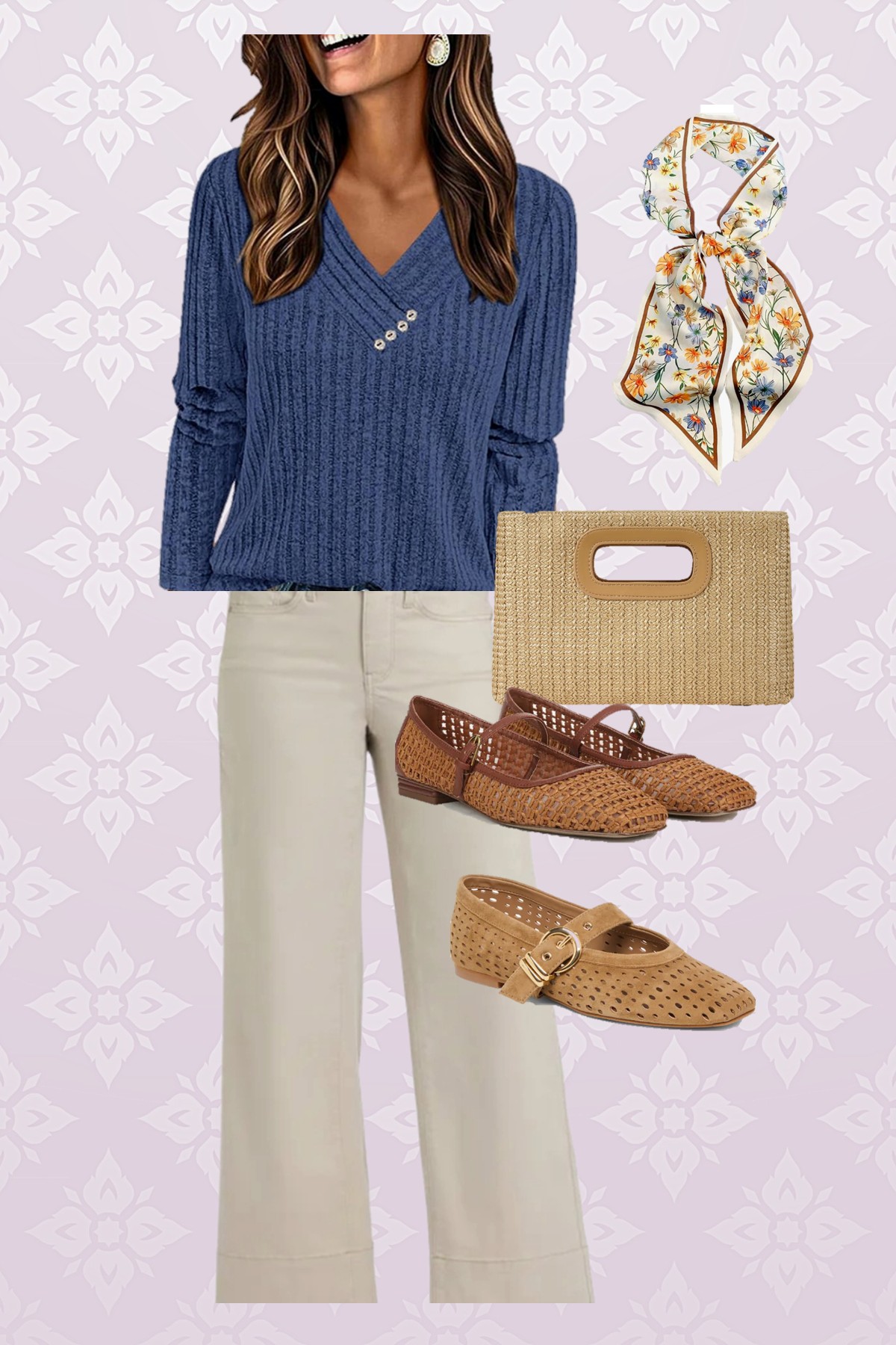 This next look is a mix of higher and lower priced pieces. Besides the top, the scarf and clutch are from Amazon. This scarf comes in lots of pretty designs. Wearing a scarf tied around your neck or purse strap is going to be a popular fashion statement this spring.
