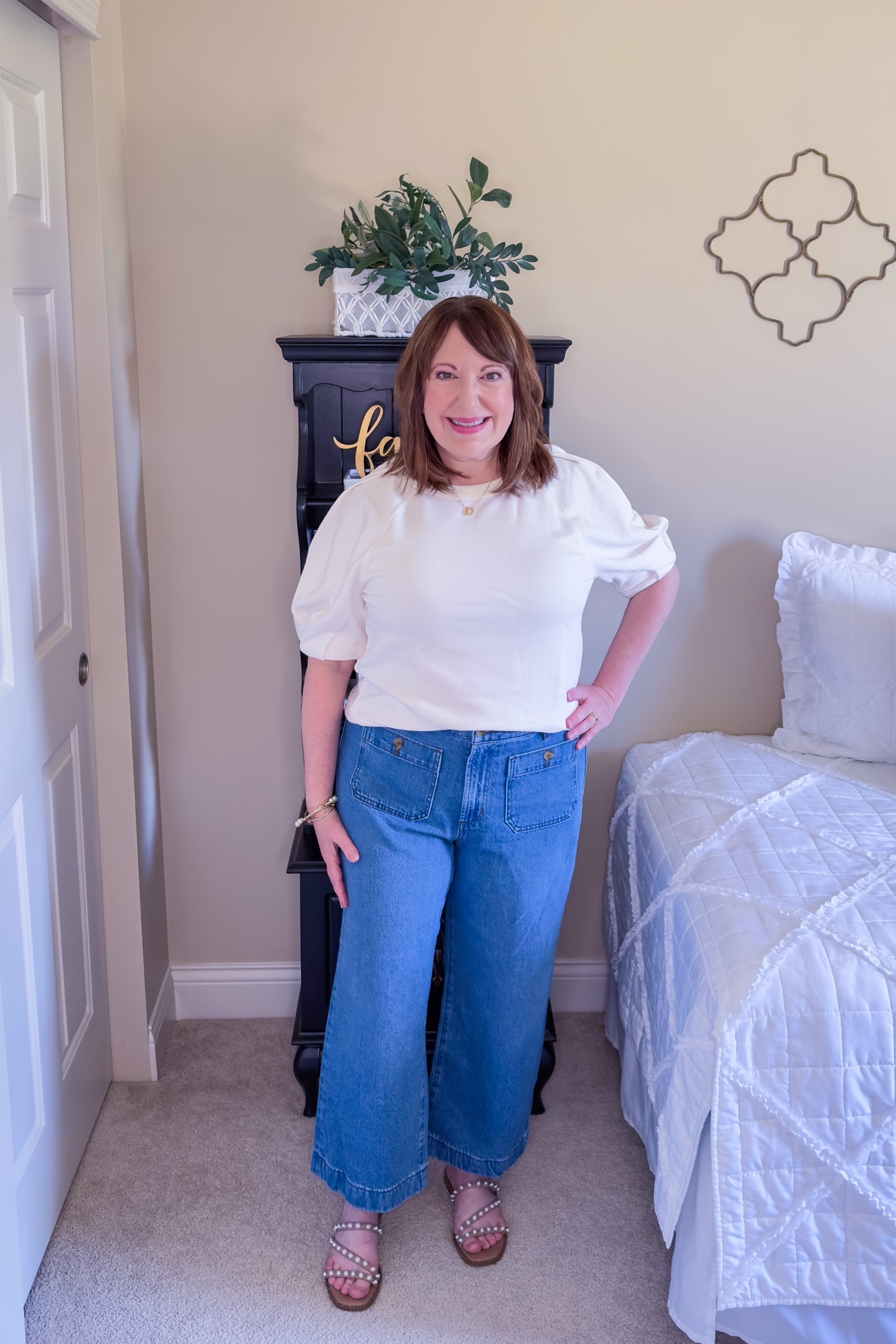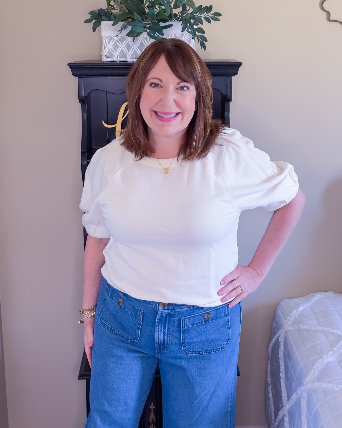 I don’t wear a lot of jewelry, especially working from home. And I like keeping my jewelry simple – it just feels more appropriate for me and my short frame. However, I do like dressing up a white blouse or sweater with a little jewelry like this initial necklace. It’s one of my favorite pieces! A light neutral background makes your jewelry stand out whether layering several pieces or keeping it simple with one pendant.