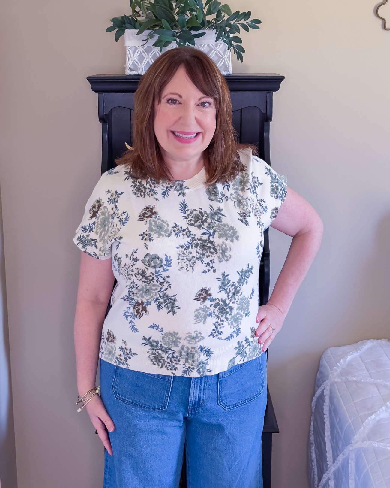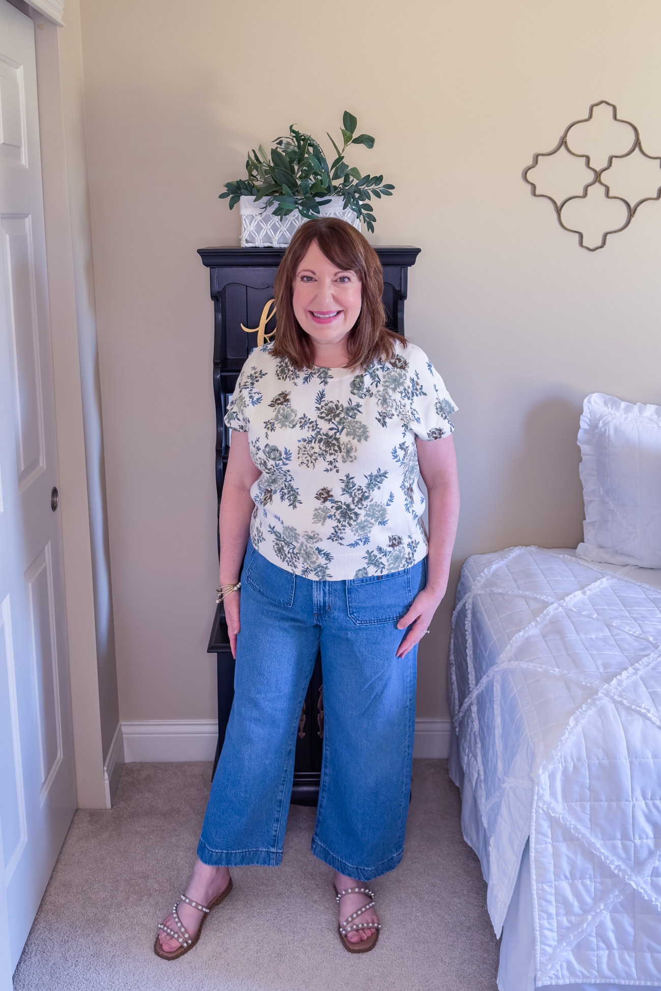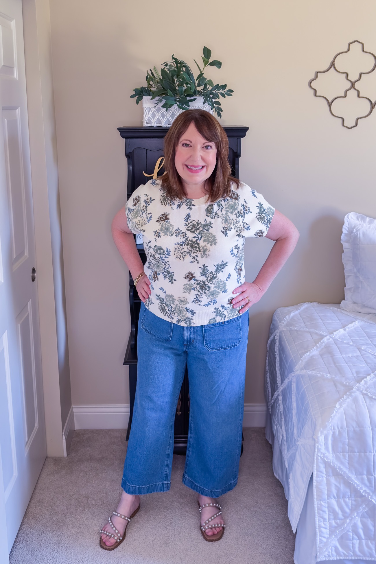 I have some of Loft’s Palmer shorts from last year and love the fit. So, I decided to take a chance on these Palmer jeans and am so glad I did. So many wide leg jeans overwhelm me, yet these are proportioned just right. I purchased my usual size in petite, but they do run slightly big. I might could have sized down, but I don’t like things too tight in the waist either. These wide leg jeans are a great option for spring and summer – the loose fit will be breezy and cool.