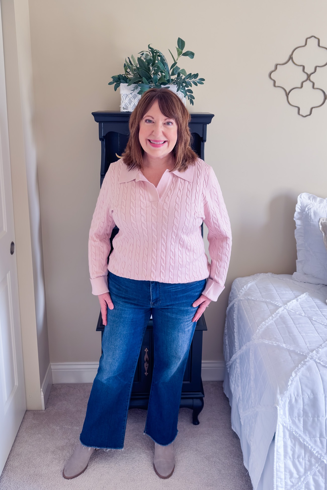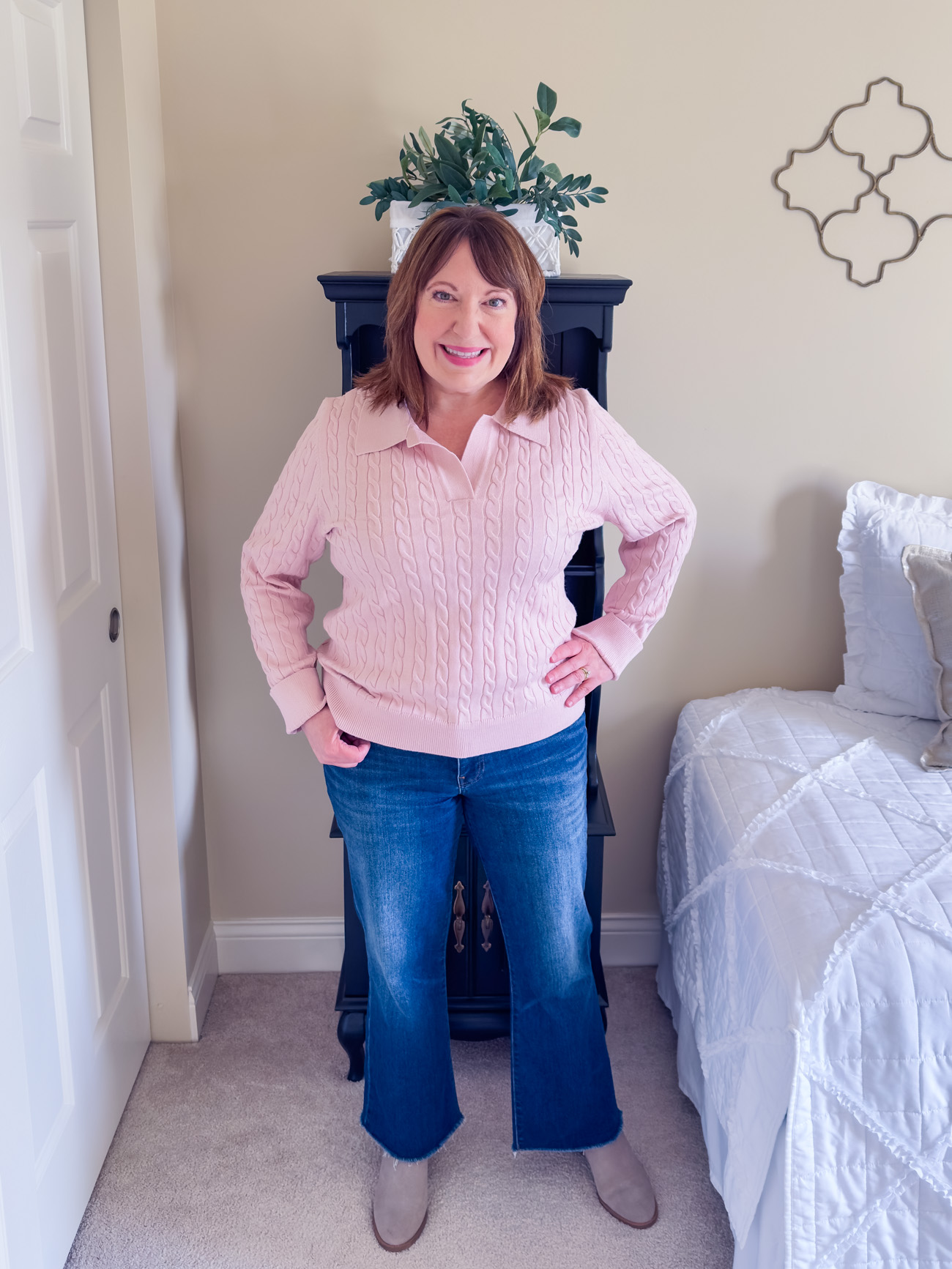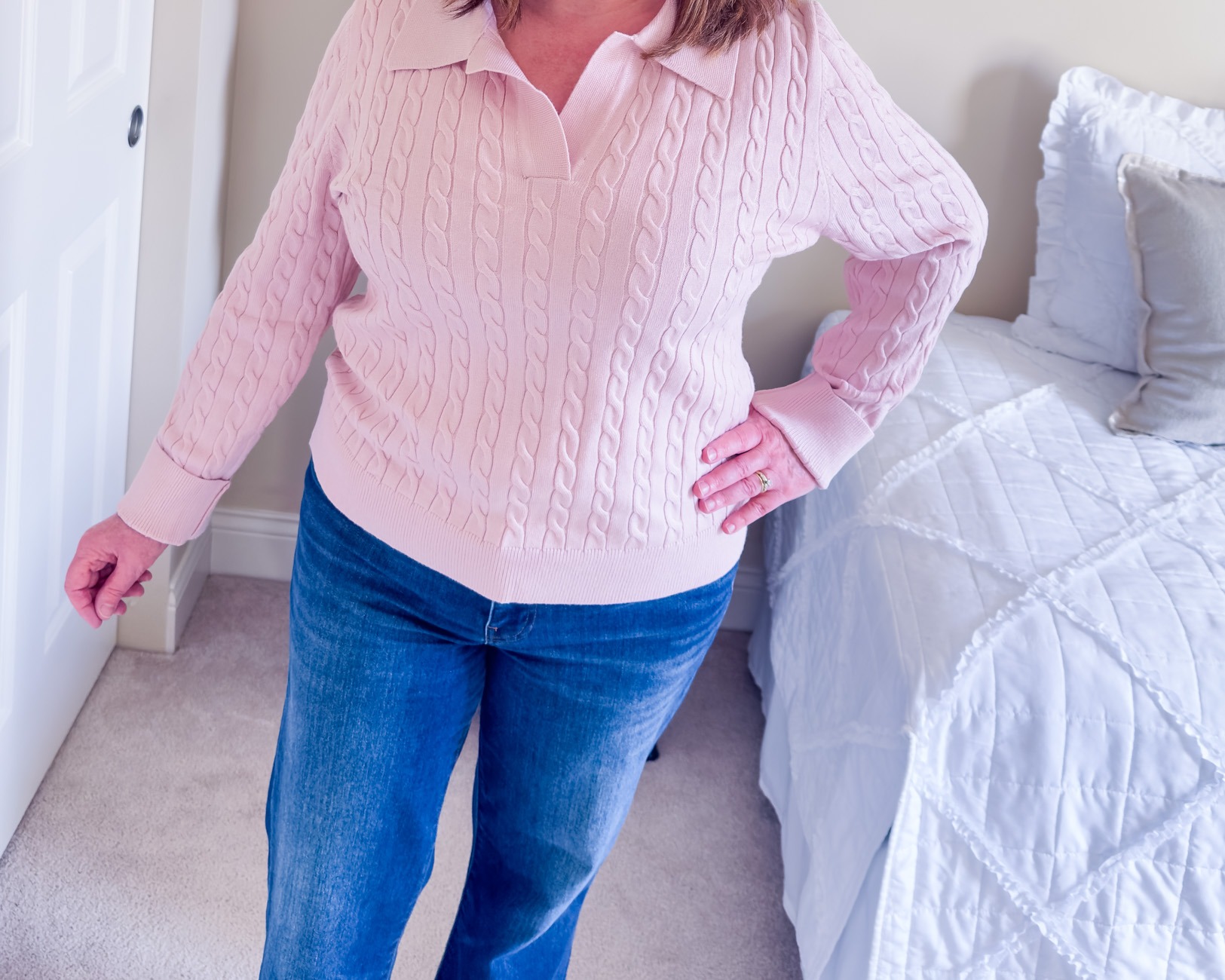 I’m also one who doesn’t like the typical polo neckline with a collar, especially now that I wear my hair shoulder length. However, the collar on this sweater lays very flat, and I hardly notice it. This pink cable sweater is another great Amazon find!