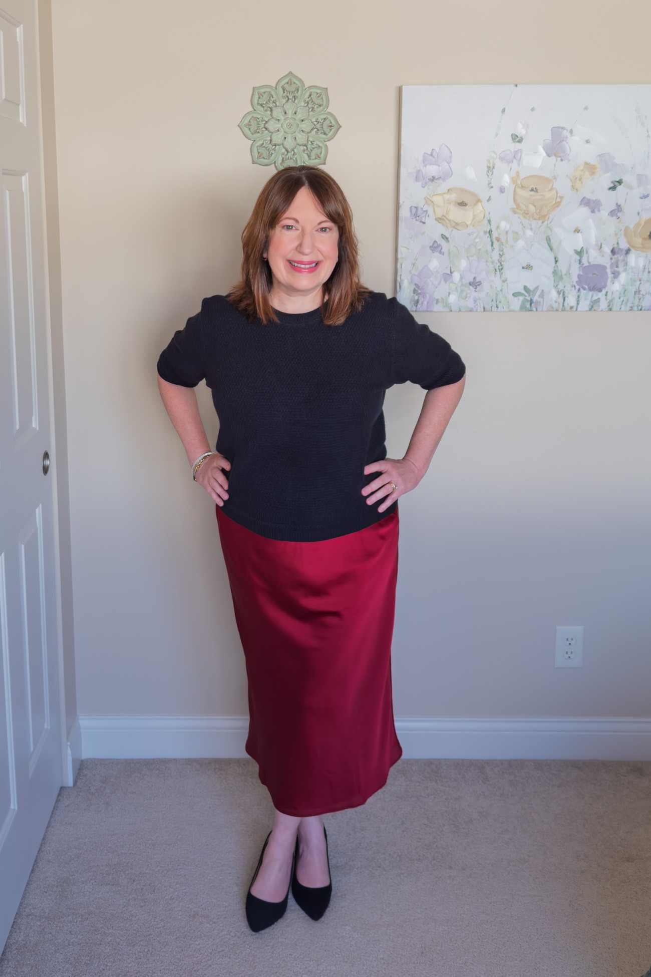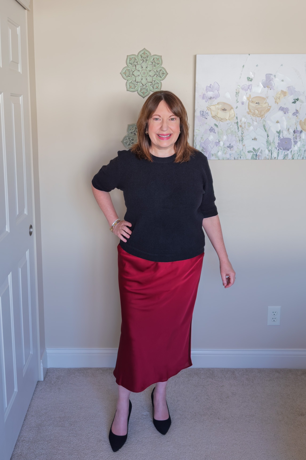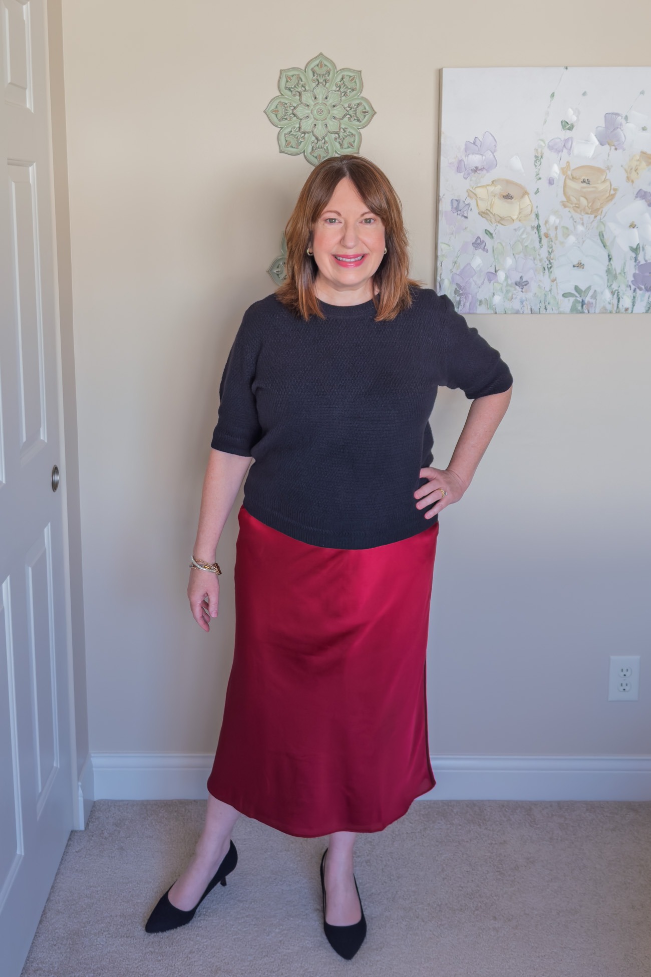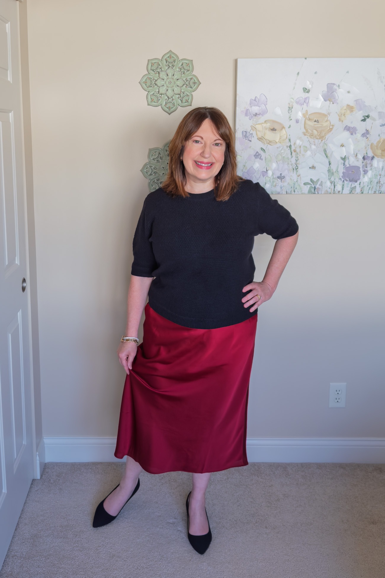 There are a few other color choices here, but petite sizes are extremely limited. I did find a few satin skirt options in red at Amazon like this Pretty Garden midi satin skirt and this BTFBM skirt. While these might run a bit longer if you are petite, I’ve had good luck ordering from Amazon as far as fit goes.