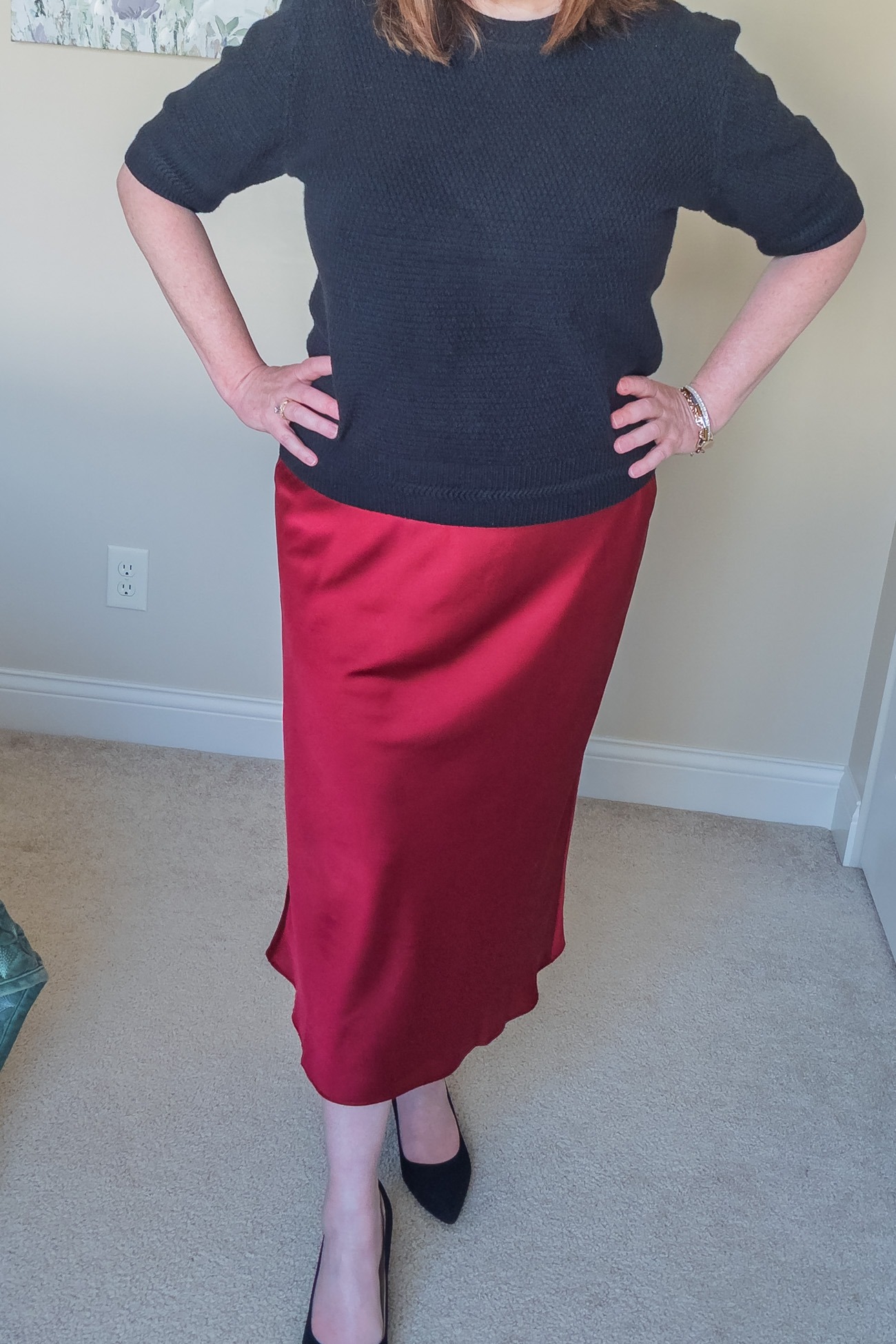 A satin skirt is such an elegant wardrobe staple. And skirts in general are gaining popularity! I used to think skirts were hard to style. However, I don’t think that now, especially with sweaters. If you choose the right color for your closet, your skirt can be a versatile best friend.
