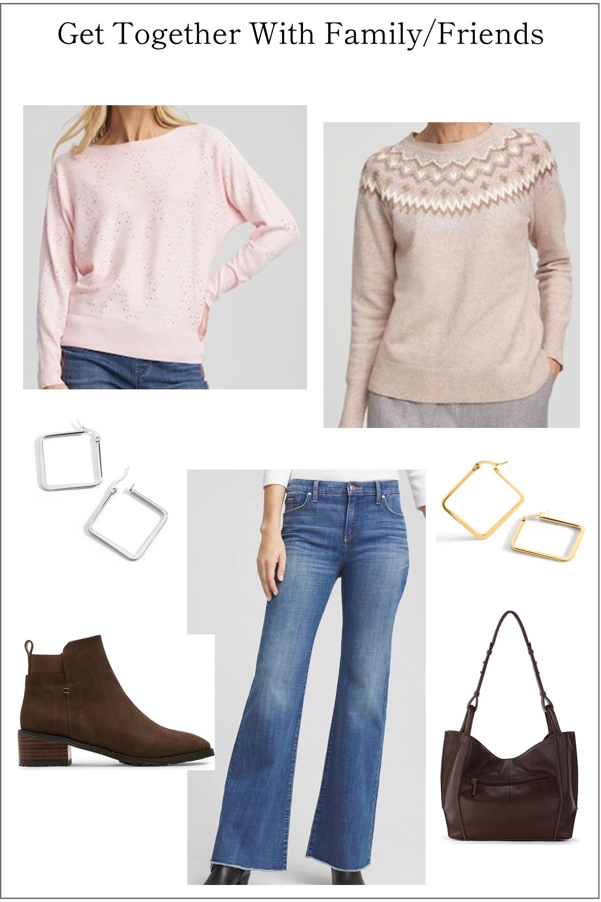 Dress in: Chico’s Pink Studded Sweater or Fair Isle Sweater | Jeans | Boots | Earrings | Bag