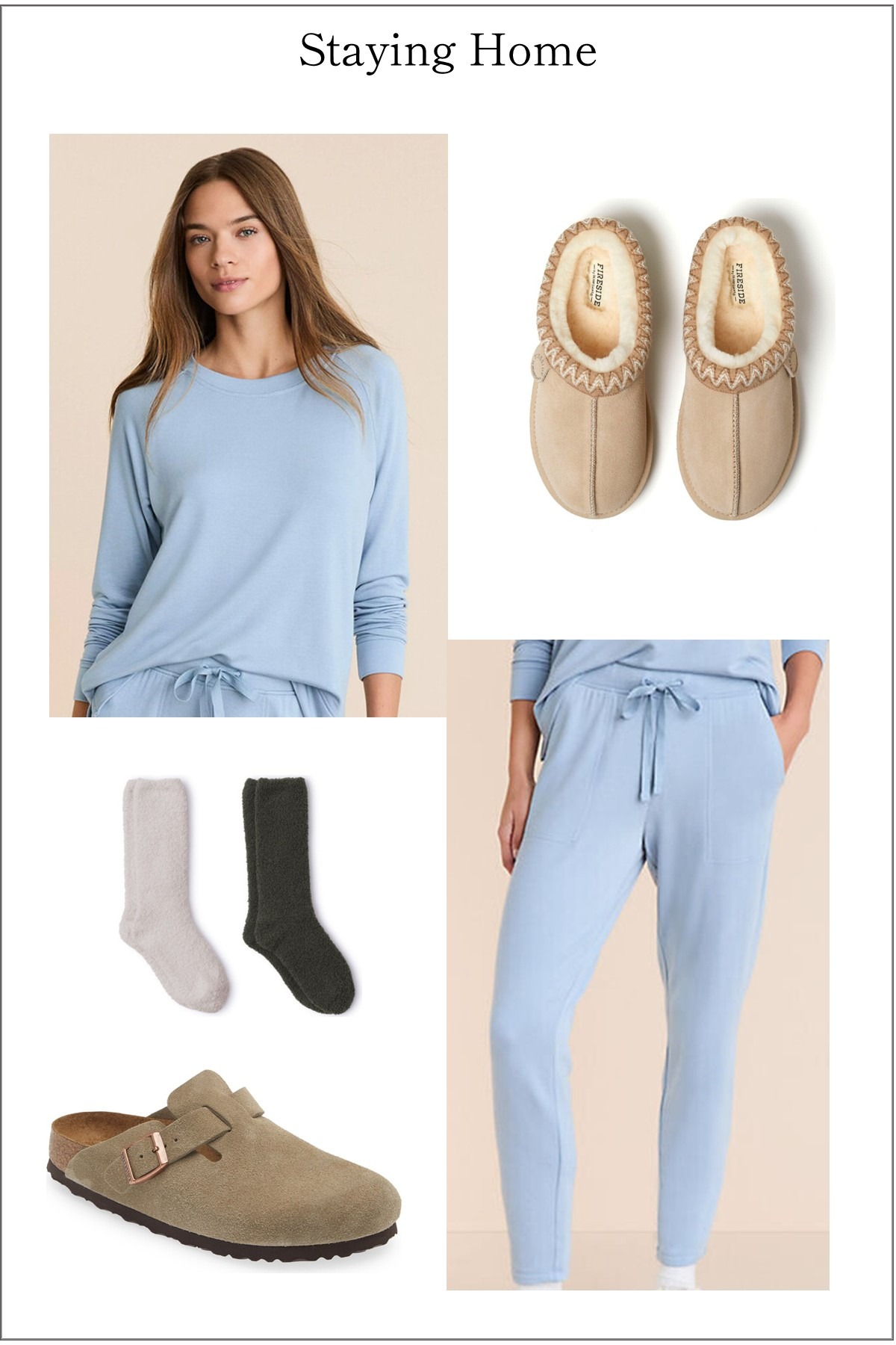 Dress in: Loft Sweatshirt | Loft Sweatpants | Birks or Dearfoam Clogs | Barefoot Dreams Socks